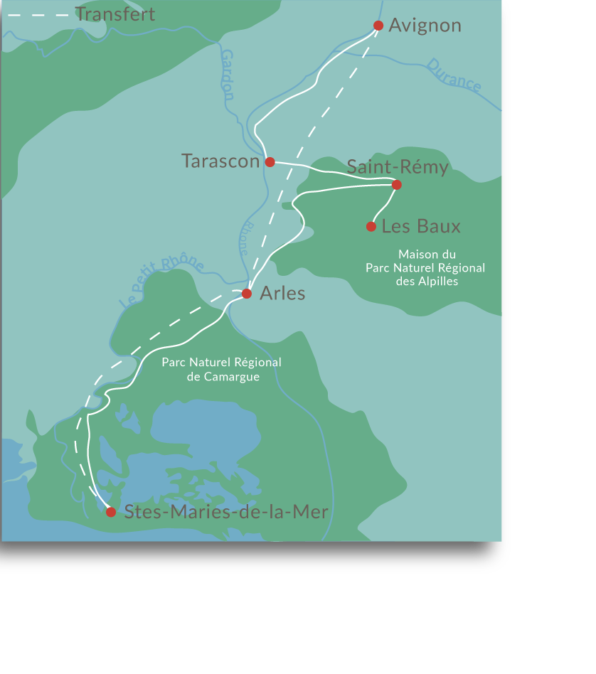 Sie verlassen Avignon auf kleinen ruhigen Straßen und radeln Richtung Tarascon. Auf dem Weg passieren Sie Boulbon und andere malerischen Dörfer. Sie erreichen Tarascon, eine schöne kleine sehr charmante Stadt mit seiner auf dem Hügel thronenden Burg. Sie übernachten im charmanten 3* Hotel.