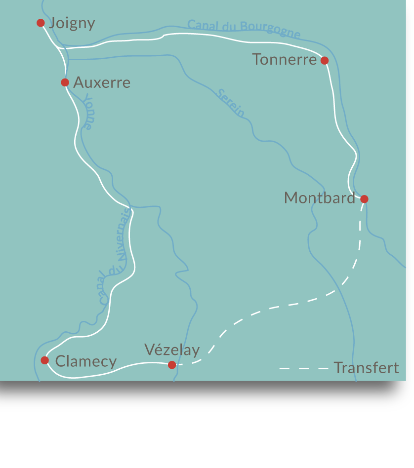 Auf dem Radweg entlang des Canal de Bourgogne radeln Sie an den Hüttenwerken Buffons vorbei, bis Sie das Renaissanceschloss Ancy-le-Franc erreichen. Ancy-le-Franc zählt zu den schönsten Renaissanceschlössern Burgunds. Anschließend kommt nach wenigen Kilometern ein weiteres Renaissanceschloss  Tanlay, welches gleichzeitig ein Wasserschloss ist. Etappenziel ist die Stadt Tonnerre. Hier können Sie Ihr Fahrrad abstellen und das kleine Städtchen zu Fuss erkunden.