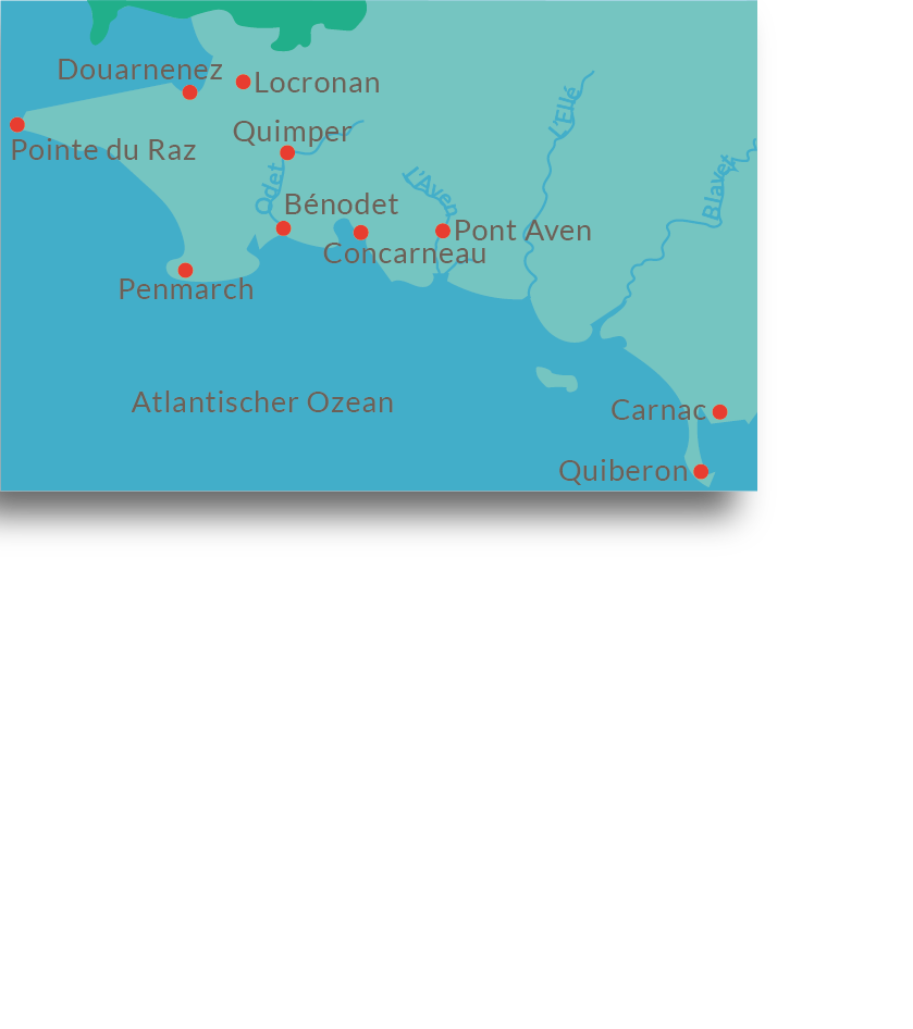 Diese Radreise durch die bretonischen Naturschönheiten führt durch die Départements Finistère und Morbihan. Quimper, die schönste Stadt der Bretagne, Point du Raz, der westlichste Punkt Frankreichs, Carnac mit seinen unglaublichen Steinreihen und die Küstenlandschaft der Cornouaille. Paradiesische Strände, einsame Felsbuchten und farbenreiche bizarre Felsformationen prägen diese Radreise, deren Entdeckungen von einem sehr schön gelegenen Charmehotel aus unternommen werden.