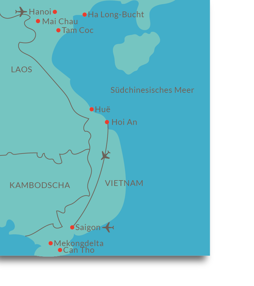 Am Vormittag Ankunft in Hanoi und Transfer zu unserem Hotel im Stadtzentrum. Am Nachmittag besichtigen wir die Stadt – wie sollte es anders sein – per Rikscha! Am Abend erstes gemeinsames vietnamesisches Abendessen.