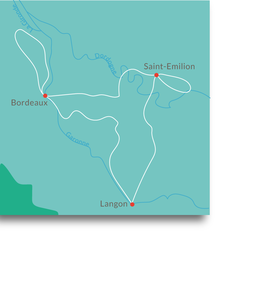 You leave Bordeaux and cycle along a wonderful bike path near the Garonne towards the Abbey Notre-Dame-de-la Sauve-Majeure, which is located in the large forest Entre-Deux Mers. After passing the forest, vineyards, Cadillac and Sainte Croix du Mont you finally reach your destination Langon.